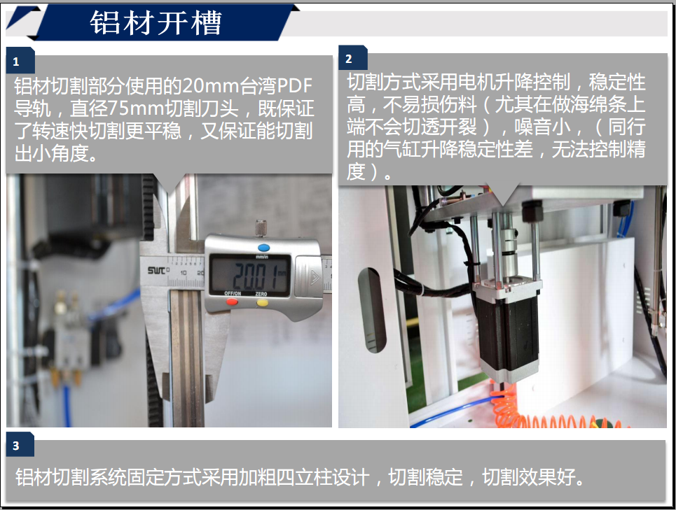 1.鋁材切割部分使用的20mm臺灣PDF導軌,直徑75mm切割刀頭,既保證了轉(zhuǎn)速快切割更平穩(wěn),又保證能切割出小角度。