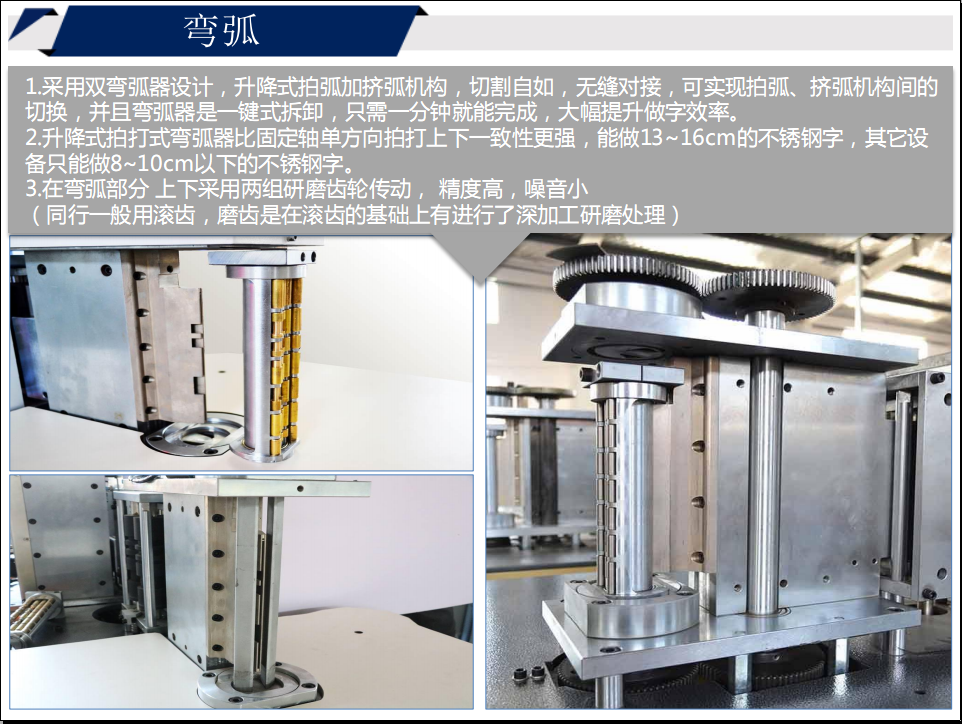2. 升降式拍打式彎弧器比固定軸單方向拍打上下一致性更強,能做13~16cm的不銹鋼字,其它設備只能做8~10cm以下的不銹鋼字。